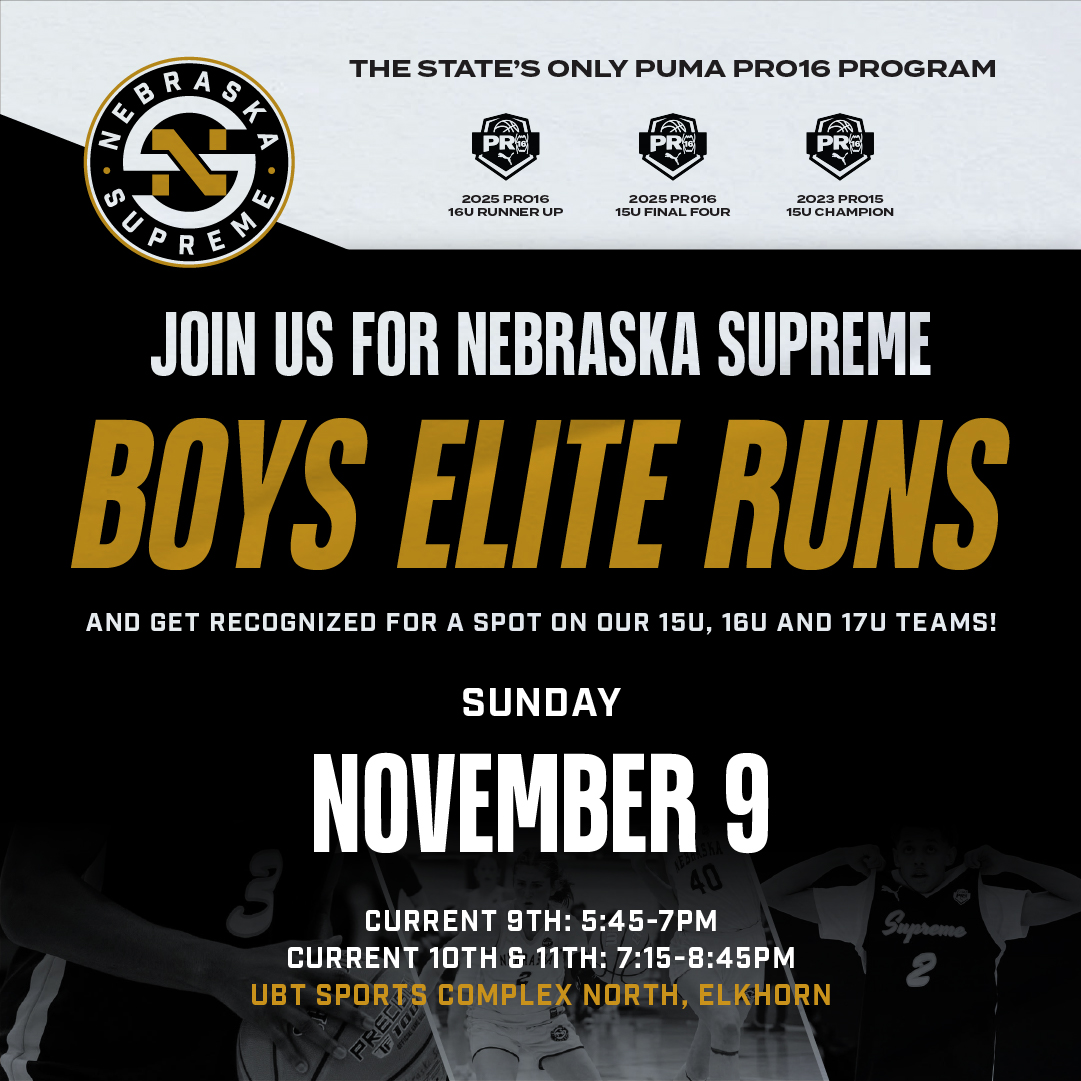 Nebraska Supreme Boys Elite Runs REGISTER Date November 9, 2025 Season Fall / Winter Location UBT Sports Complex North Elkhorn, NE Additional Details Join us for Nebraska Supreme Elite Runs and get recognized for a spot on our 15U, 16U, and 17U teams! Sunday November 9th • Current 9th 5:45 PM-7:00 PM• Current 10th/11th 7:15 PM-8:45 PM